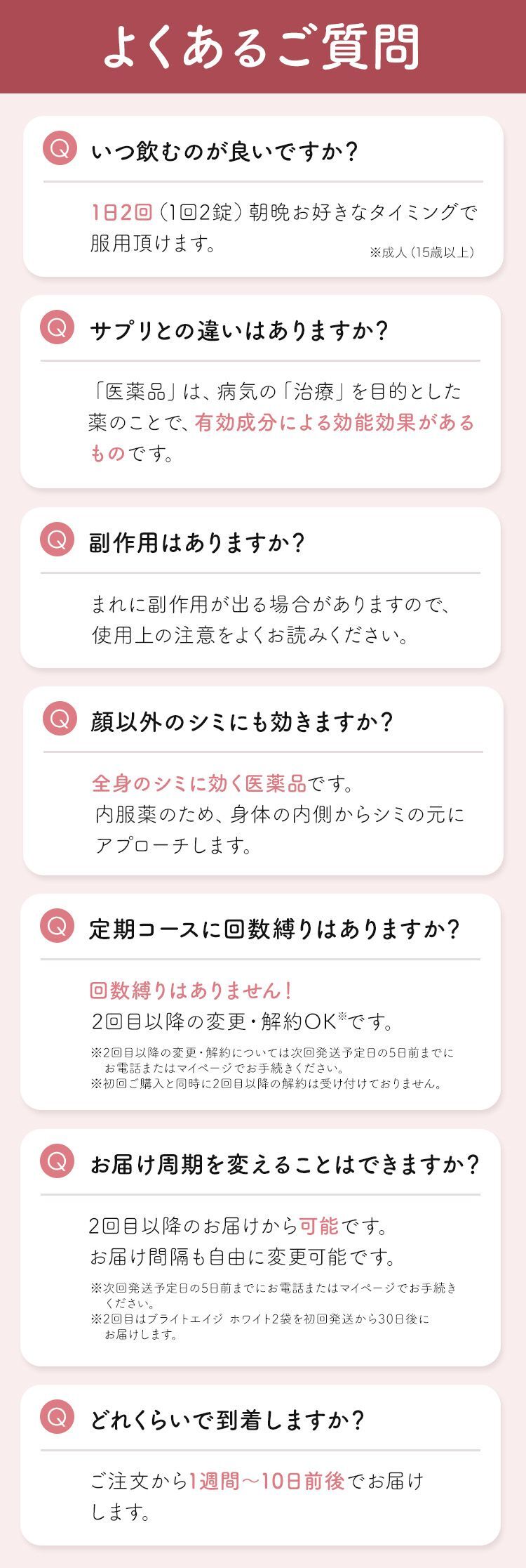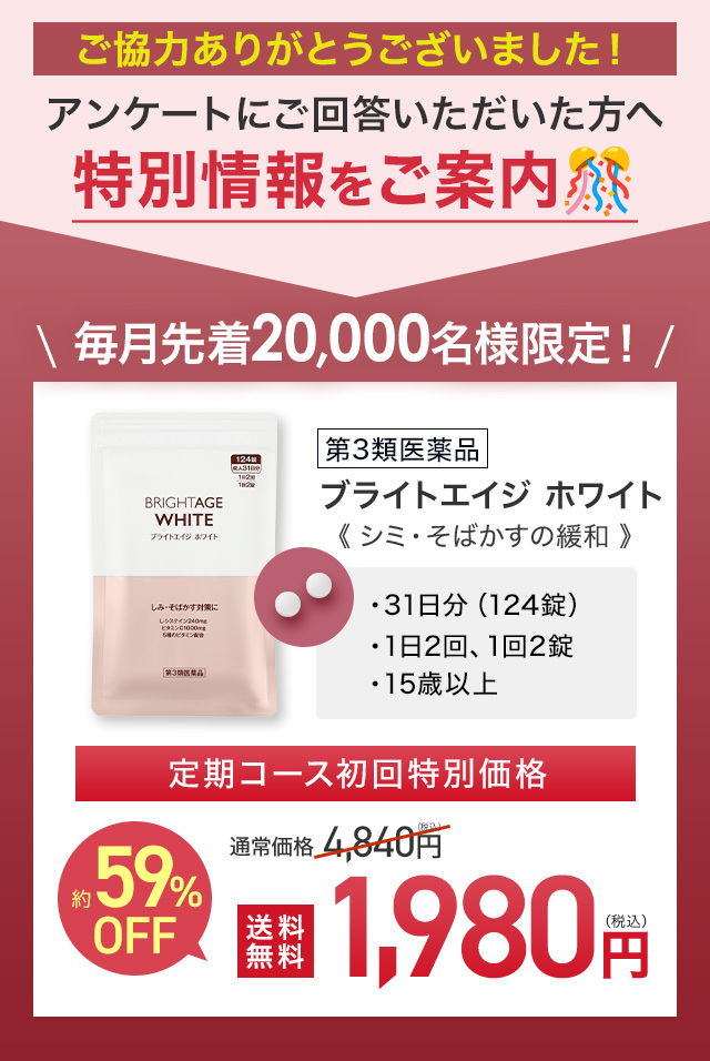 初回はブライトエイジ ホワイト1袋と飲み忘れ防止ポケットをご注文から1週間程度でお届けいたします。2回目はブライトエイジ ホワイト2袋を初回発送日から約30日後、3回目以降はブライトエイジ ホワイト2袋を前回発送日を基準に約60日ごとにお届けいたします 。
