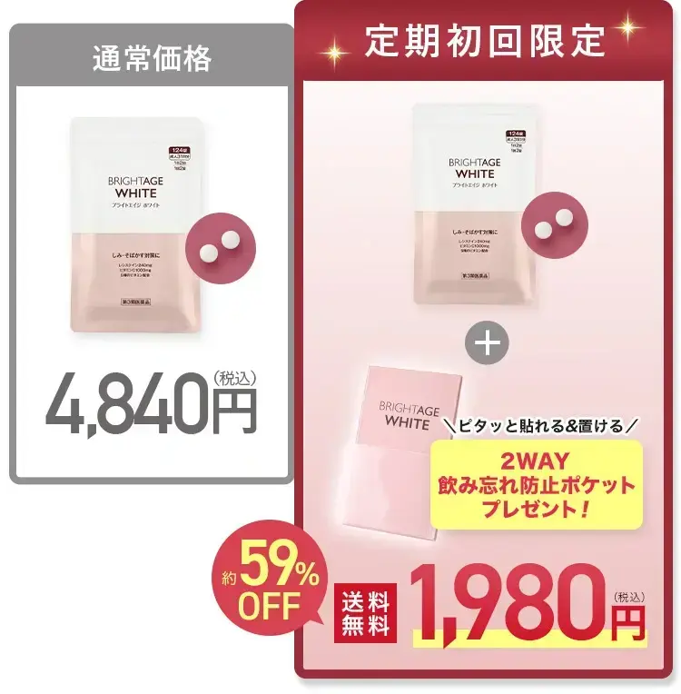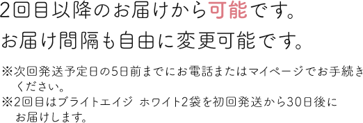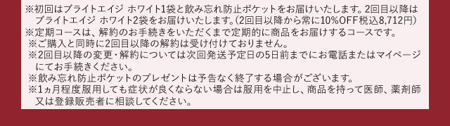 初回はブライトエイジ ホワイト1袋と飲み忘れ防止ポケットをご注文から1週間程度でお届けいたします。2回目はブライトエイジ ホワイト2袋を初回発送日から約30日後、3回目以降はブライトエイジ ホワイト2袋を前回発送日を基準に約60日ごとにお届けいたします 。